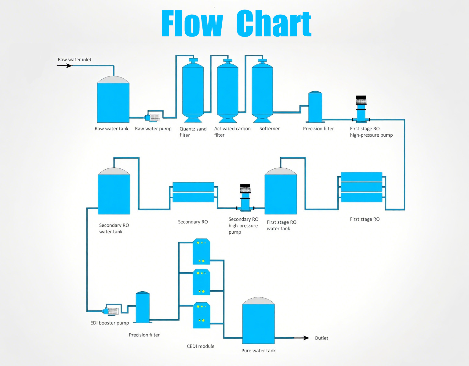 Feed water→Multimedia filter→Activated Carbon filter→Water softener→ Precision filter→High pressure pump→1st RO module→PH adjustment→2nd RO module→EDI module→Water tank . |